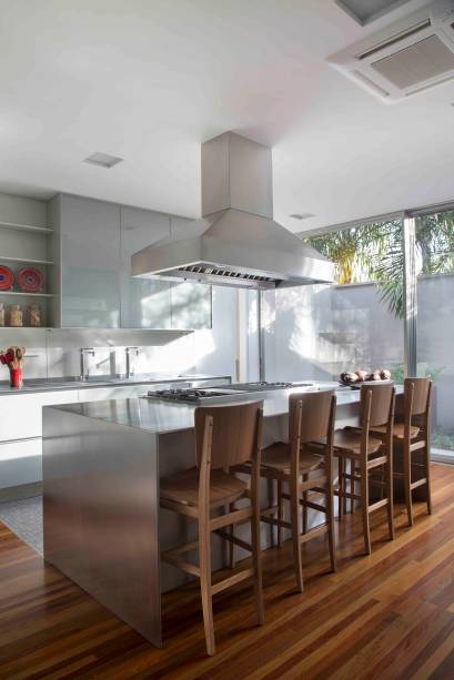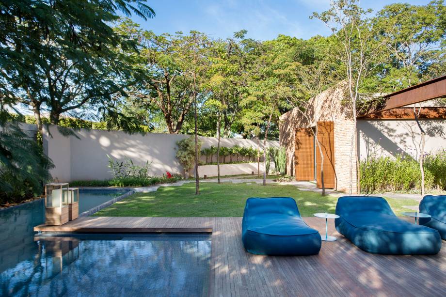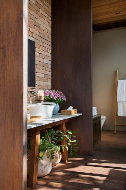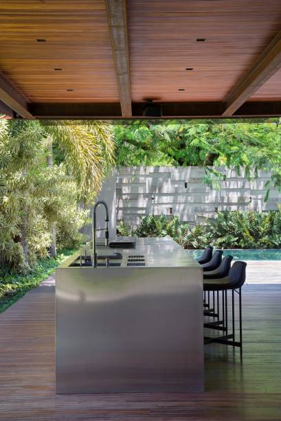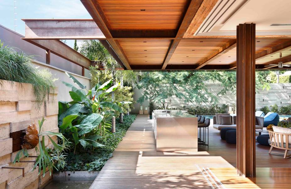 A construção tem estrutura metálica, concreto, aço corten, tijolinho e madeira naturais aparentes, com piso em cumaru desde a entrada principal até o deck da piscina, garantindo, assim, unidade visual e sensação de amplitude. “Apenas na área molhada da cozinha, em frente à bancada, revestimos o piso com pastilha de vidro em tom claro”, informa Solange.