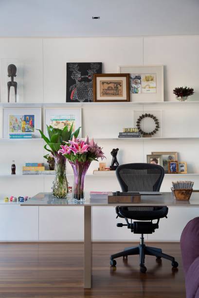 De estilo contemporâneo atemporal, a decoração também reflete a personalidade da família e conta um pouco de sua história, já que peças de valor afetivo trazidas da residência antiga (incluindo alguns clássicos do design contemporâneo internacional, como o sofá e o pufe Strips, da Cini Boeri, e a poltrona Eames Lounge Chair, do Charles Eames) convivem em total harmonia com peças novas, pautadas, sobretudo, pelos quesitos ‘conforto e proporção’ e pela admiração da arquiteta pelo design brasileiro, a exemplo das cadeiras de jantar Senior (do Jorge Zalszupin), a mesa de jantar Fina (da Claudia Moreira Salles), as banquetas altas Astânia (da Etel Carmona) e a poltrona Jangada (do Jean Gillon).