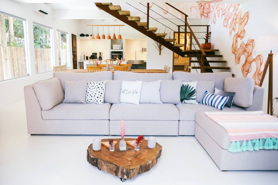 A inspiração para a construção veio da própria Bahia, que segundo Isabel, “exala beleza.” A influência para o estilo e decoração veio das cores, da natureza e suas texturas, do povo e do artesanato. “Resolvi unir o minimalismo que tanto amo, que vejo muito presente na belíssima arquitetura grega, com alguns toques de cor e texturas, que podem ser vistas na escadaria da casa, nos ladrilhos pintados à mão no terraço e na mesa de madeira maciça da sala”, afirma Isabel.