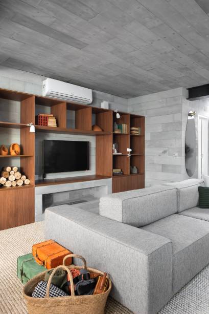Uma estante sem fundo foi desenhada para permitir que o morador e seus convidados observassem as ripas que envolvem a sala de estar e a sala de jantar, destacando a arquitetura da casa.