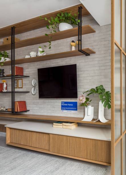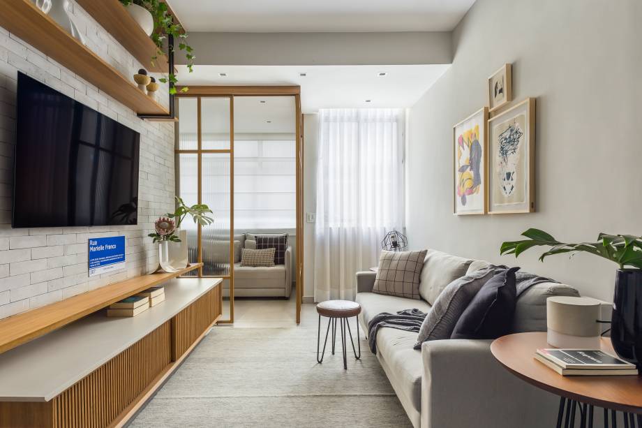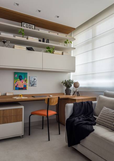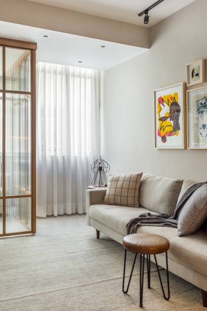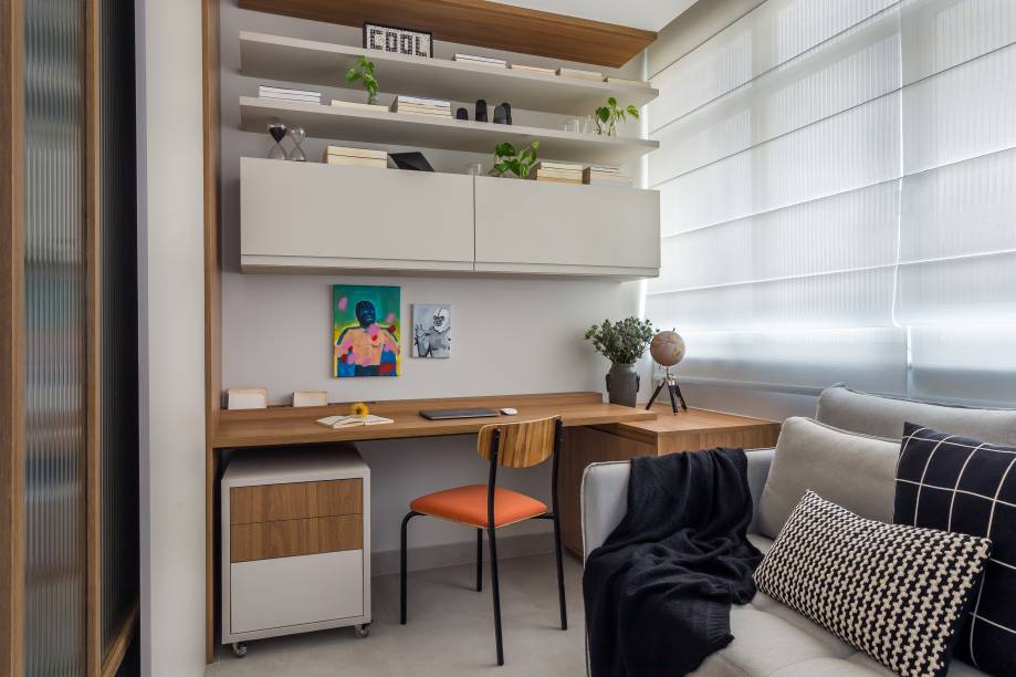 “Eliminamos o cachimbo demolindo a parede do quarto vizinho à sala e no lugar da antiga alvenaria instalamos portas de correr, com esquadrias de madeira e vidro canelado, que permitem isolar ou integrar o atual home office, que também funciona como quarto de hóspedes”, explica o arquiteto.