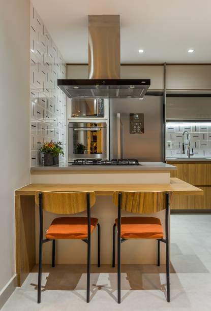 “Quando as portas de correr estão completamente abertas, a sala de estar com tv parece bem mais ampla e ainda recebe mais luz natural”, acrescenta ele. As paredes que delimitavam as dependências de serviço também foram demolidas para criar o atual banheiro social e ampliar a cozinha (que ganhou ainda uma “península” com cooktop), agora aberta e integrada à sala de jantar.