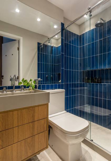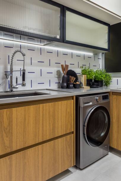Em se tratando de cores e materiais de acabamento, no geral, o arquiteto investiu em tons de cinza, tijolinhos cimentícios off white, esquadrias de madeira, vidros canelados, azulejos com estampas geométricas minimalistas e marcenarias ora em freijó natural ora em laca.