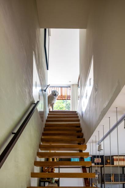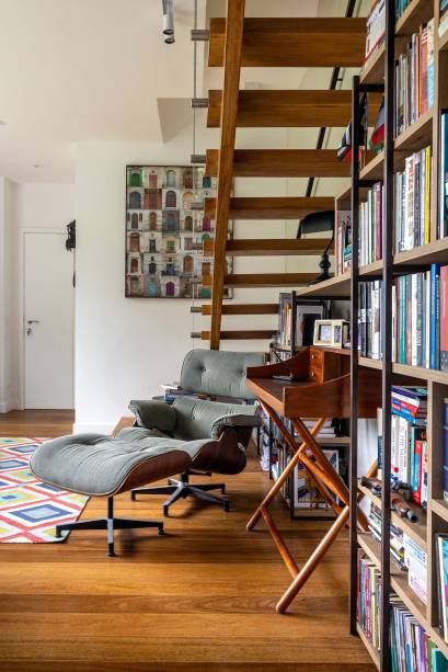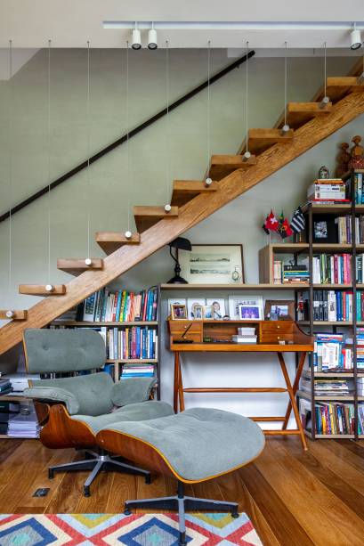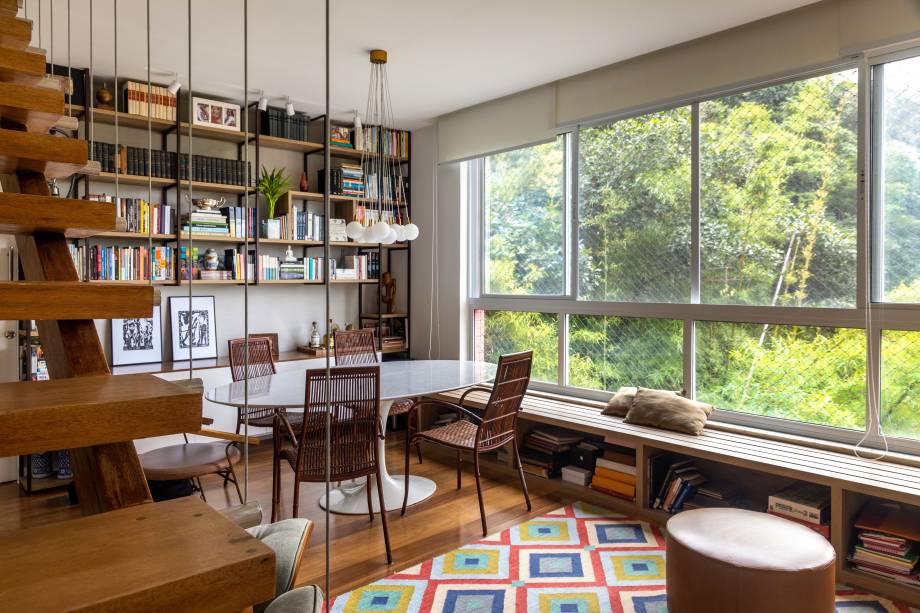 Já eram deles, por exemplo, a poltrona Lounge by Charles Eames (que foi reformada), a mesa de jantar Saarinen, as cadeiras de jantar em ferro e fibra natural, a escrivaninha sob a escada, os adornos e os livros. Para completar o espaço, foram adquiridos não só estante como também o tapete, o extenso banco sob a janela, os cabos de aço fixados nos degraus da escada e os itens de iluminação.