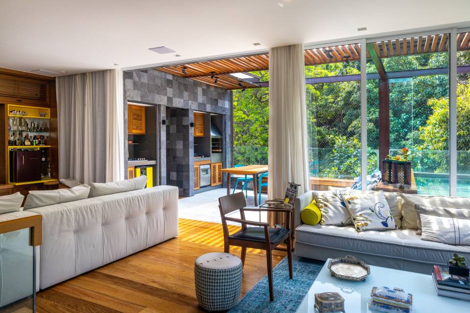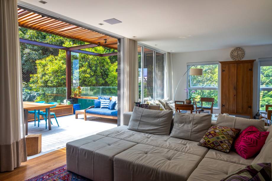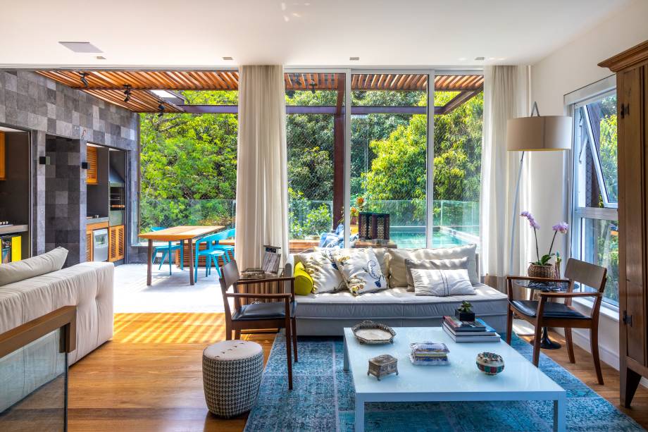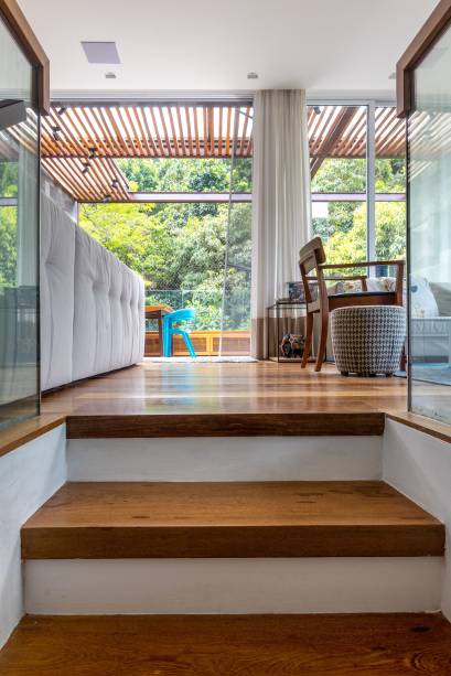 No primeiro andar, o projeto da arquiteta contemplou a sala, o quarto da filha mais velha e o quarto do casal, enquanto, no segundo andar, ela mexeu na sala, no quarto, no banheiro e na área externa. “Também fizemos pequenas interferências no quarto das duas filhas, na copa-cozinha e no hall social do elevador”, revela Ketlein.
