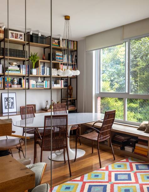 A partir daí, a arquiteta propôs integrar os dois espaços, uma vez que a mesa de jantar também poderia servir de apoio de leitura ou estudo. Com estrutura vazada de alumínio que lembra aço cortén e prateleiras de madeira rústica, as estantes de livros piso-teto foram projetadas pela arquiteta especialmente para o espaço, tornando-se um elemento de destaque no décor. De resto, ela mesclou peças que já faziam parte do acervo da família com novas.