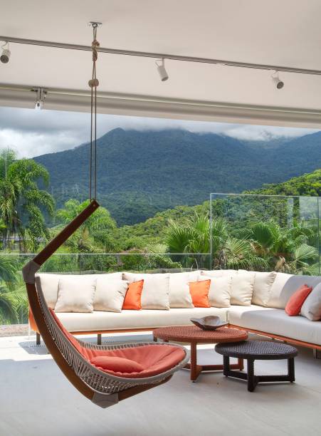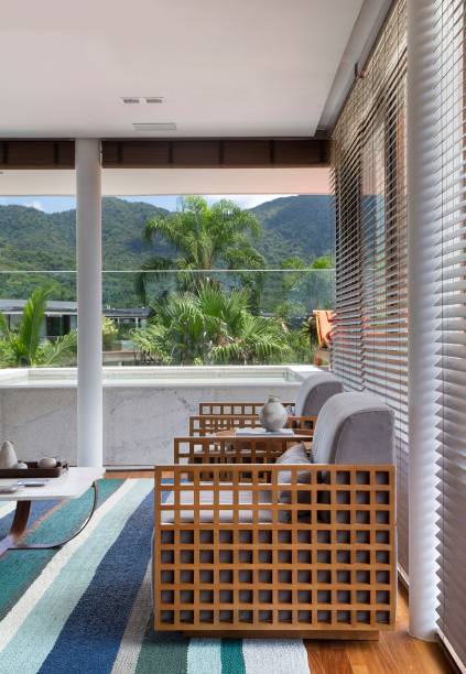 O principal destaque tanto na decoração quanto na arquitetura de interiores é o mobiliário, que é ao mesmo tempo sofisticado e descontraído. Além disso, toda a área interna interage com o ambiente externo por meio de um amplo terraço, que pode ficar totalmente integrado. Guarda-corpos de vidro transparente ajudaram a aumentar essa sensação de integração com a paisagem verde ao redor.