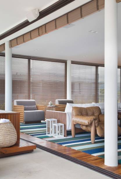 O arquiteto usou cores neutras na arquitetura e no mobiliário da área interna, reservando os tons mais vibrantes nos acessórios. O tapete listrado, por exemplo, virou grande atração na decoração da área social. Já na área externa ele se permitiu um toque de ousadia, usando a cor laranja como base para contrastar com a paisagem do entorno.