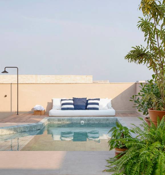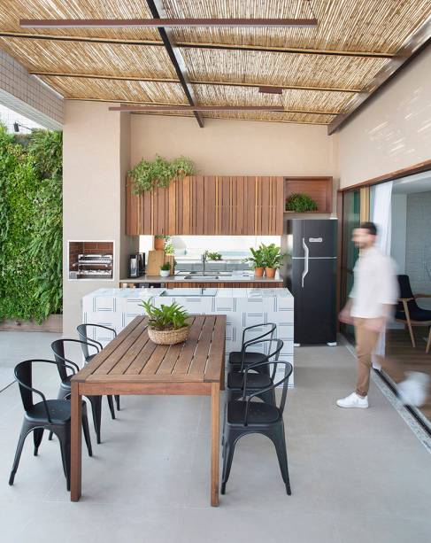 “Criamos três ambientes na área externa da cobertura. Uma área gourmet completa, com mesa, bancada e churrasqueira. Uma área de estar descoberta, que tem como pano de fundo o jardim vertical. E a área da piscina”, detalha Gustavo.