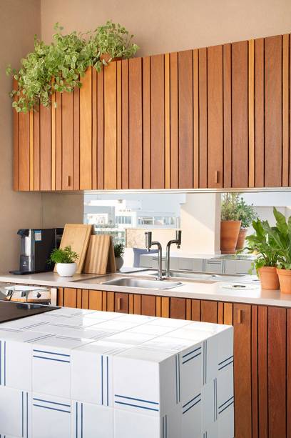 Outro destaque do projeto é a marcenaria da sala principal, desenhada pelos arquitetos, em especial a estante em freijó com espelhos, compondo o canto do bar, e, do outro lado, o móvel-rack sob a TV, com espaço para armazenar discos de vinil. Já no andar superior, a dupla destaca os azulejos com estampa geométrica usados na ilha do cooktop da área gourmet e na parede do lavabo.