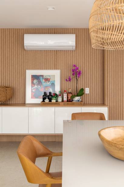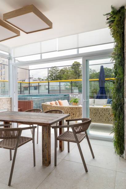 Antes delimitado por um telhado de barro em meia água, o espaço da churrasqueira também foi demolido para dar lugar a uma construção anexa, de alumínio e vidro, que hoje abriga um espaço gourmet completo, totalmente integrado à sala, com cozinha, mesa de refeições com seis lugares e um balcão alto com quatro banquetas, ideal para reunir amigos e parentes. “Para aumentar a sensação de integração entre os ambientes internos e externos, instalamos portas de correr que abrem no mesmo sentido”, detalha Phil.