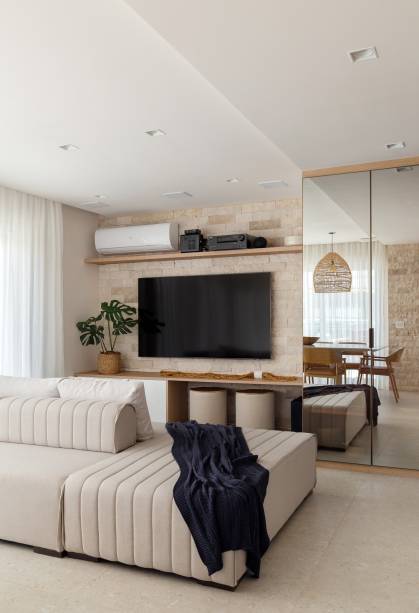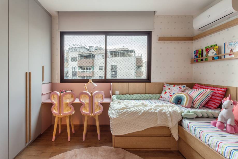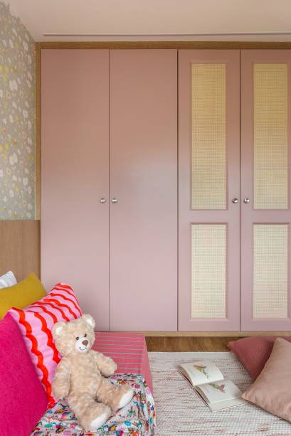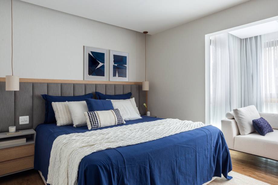 Já na suíte master, a varanda foi fechada com cortina de vidro e integrada ao quarto, com nivelamento de pisos e rebaixo de teto, abrindo espaço para um canto de leitura e relaxamento próximo ao dormitório do casal.