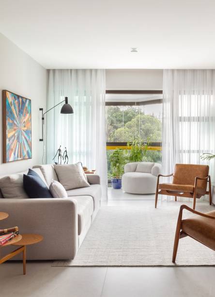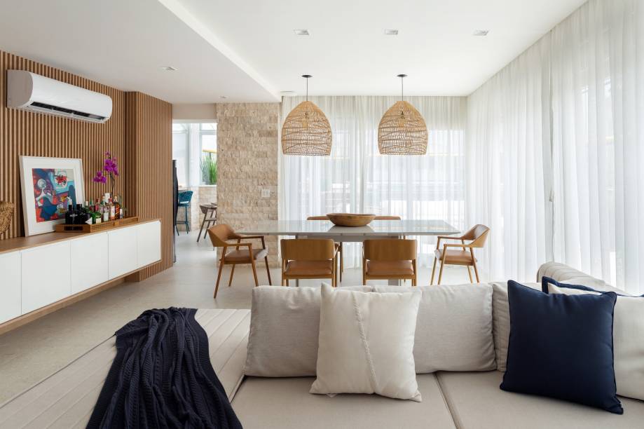 Na decoração – que segue o estilo contemporâneo urbano no piso inferior e contemporâneo praiano no piso superior -, a maioria dos móveis é nova, mas, como os clientes sempre contrataram arquitetos para decorar suas residências anteriores, eles já tinham peças boas, que foram aproveitadas no novo lar, especialmente na sala do primeiro andar.