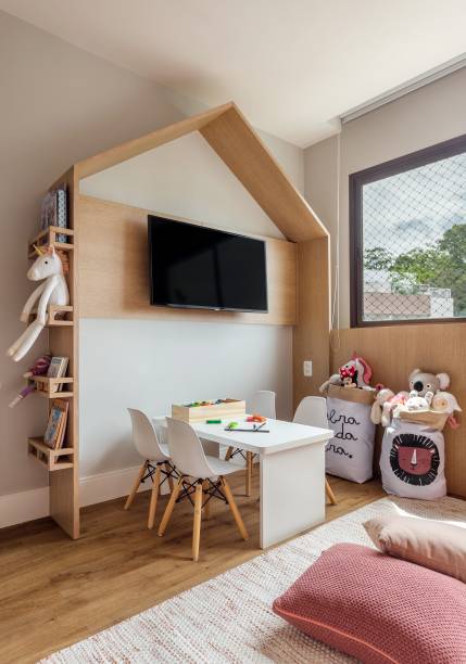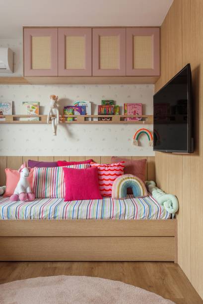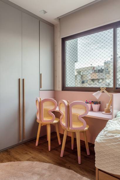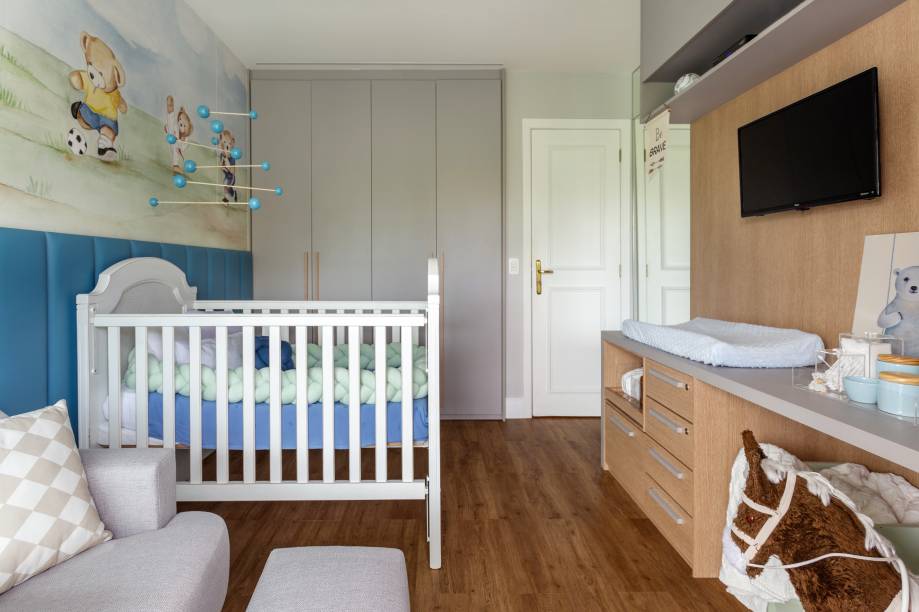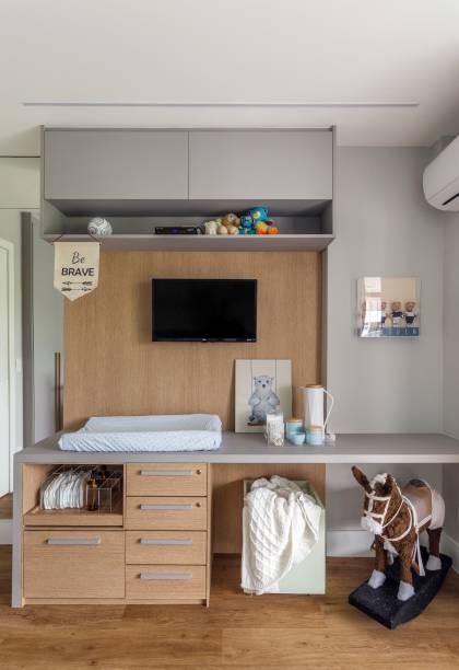 No decorrer da obra, surgiu uma grande surpresa: como a cliente descobriu que estava grávida, o escritório precisou transformar o que seria o escritório do casal no quarto do bebê e, para isso, aproveitou boa parte da marcenaria que já estava pronta e foi adaptada para assumir novas funções.