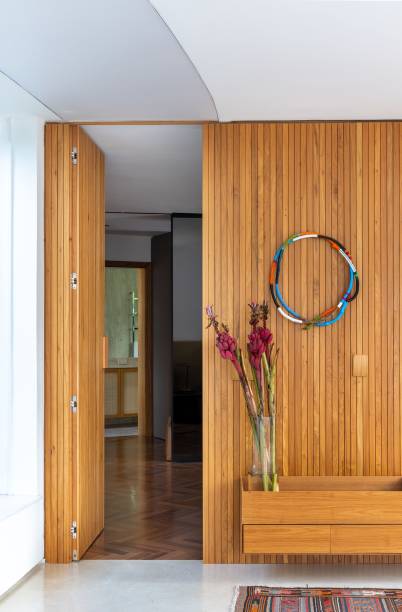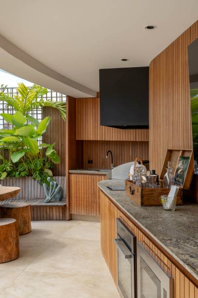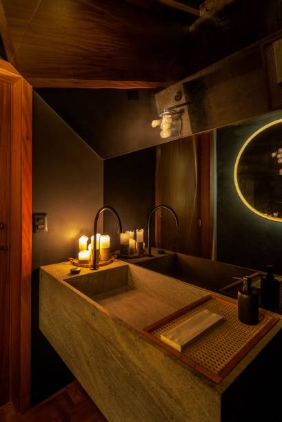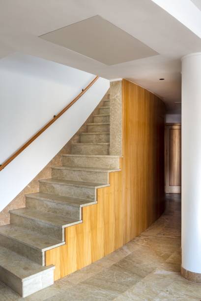 “A ideia foi criar espaços aconchegantes, mas com personalidade”, ressalta o designer. O piso originalmente em taco do primeiro pavimento foi recuperado e mantido, enquanto o piso do segundo pavimento foi revestido com mármore crema marfil, com exceção da suíte máster, que ganhou tacos de peroba-do-campo, paginados em espinha de peixe. Para deixar os espaços ainda mais acolhedores, algumas paredes foram cobertas com painéis em peroba natural, ora lisos ora ripados, enquanto a marcenaria da área externa foi executada em madeira cumaru por ser mais resistente ao tempo.
