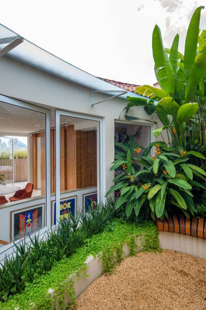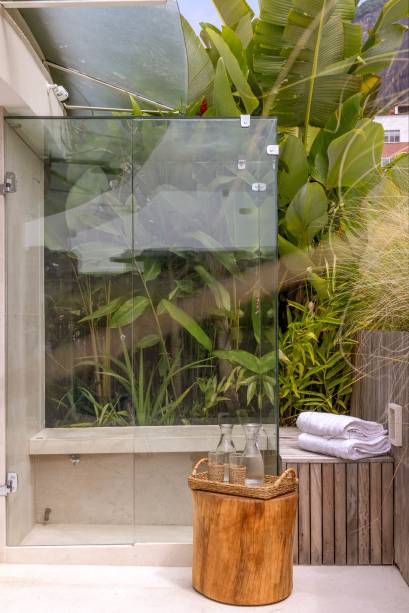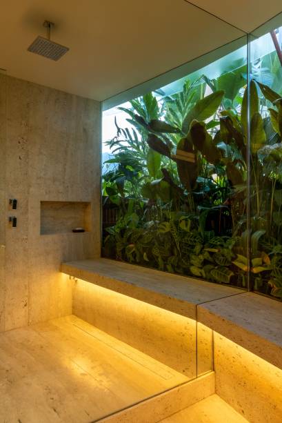 Já no segundo piso, além da remodelação do jardim interno existente, foram criados uma nova suíte com closet, um lavabo, uma sauna com paredes de vidro e um espaço gourmet na área externa, equipado com churrasqueira, fogão e refrigerador.