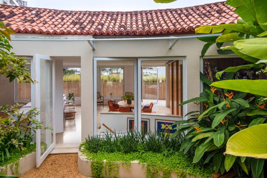 O projeto mistura texturas, materiais e peças de arte garimpadas para a cobertura de 400 m².