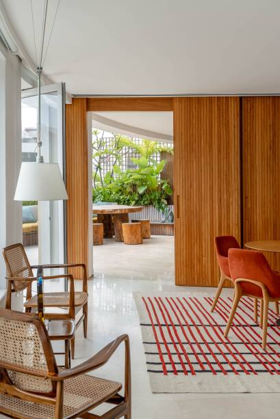 O garimpo também envolveu tapetes e peças de mobiliário brasileiro vintage, como as poltronas Oscar e o banco Magrini (em jacarandá da Bahia, do Sergio Rodrigues), as mesas de centro do living, os banquinhos de tronco de árvore usados como mesas laterais (do Zanine Caldas) e as cadeiras de jantar (de Giuseppe Scapinelli).