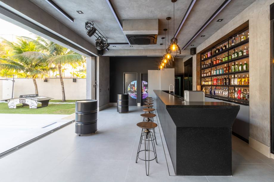 O foco central foi a edícula, antes utilizada pontualmente, transformada agora em um ambiente único e funcional: aqui, agora funciona um generoso bar e espaço para festas. A área de lazer externa, incluindo gramados e piscina, também foi completamente renovada, proporcionando uma atmosfera acolhedora.
