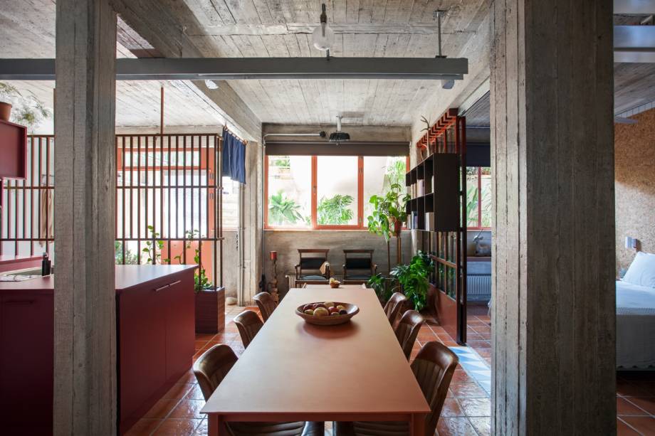 Para criar um contraste com o cinza da estrutura exposta, apostaram em texturas, como a dos ladrilhos de terracota e a cortiça na parede, e nas cores vibrantes dos armários da cozinha pintados de vermelho. Abaixo, o banheiro ganhou uma pintura azul, que deixa o ambiente mais relaxante.