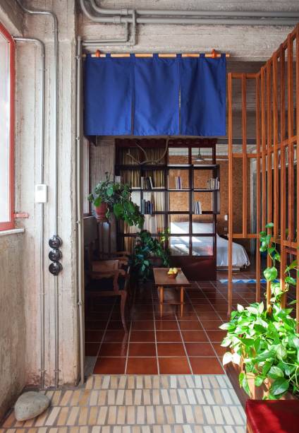 A luz natural entra apenas de um lado e, por causa disso, era fundamental que eles integrassem todos os ambientes para maximizar a luminosidade. Assim, eles não adicionaram paredes internas e demarcaram os espaços com divisórias transparentes e leves, como prateleiras suspensas, treliças de metal e painéis deslizantes de aço de vidro. Entraram também cortinas para garantir privacidade no quarto.