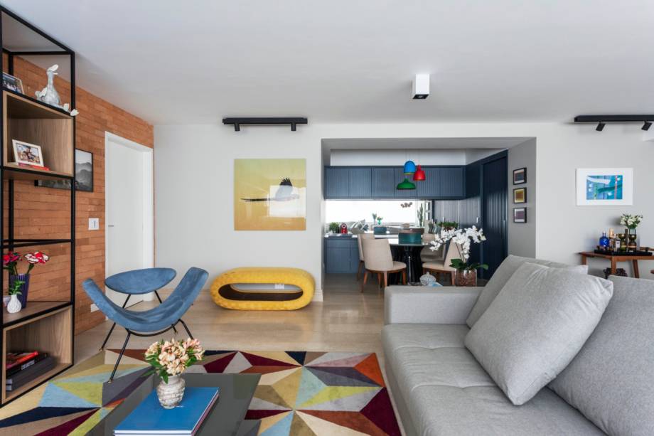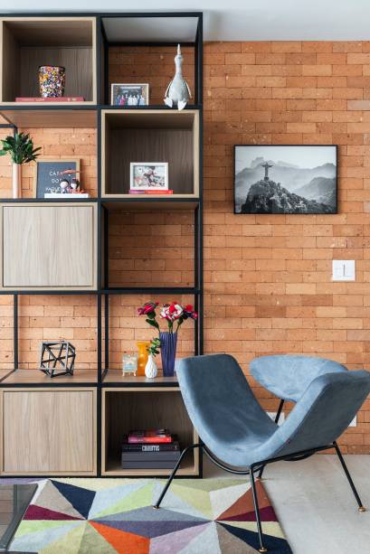 Para dar vida a esses desejos, a arquiteta investiu em um projeto pontuado por cores em todos os ambientes. Na sala de estar, o clima é de aconchego. O tapete com estampa geométrica colorida e a parede revestida de tijolinhos criam uma base descontraída para a decoração. A estante de ferro e madeira entra para trazer leveza. O piso de mármore claro era original do apartamento e foi mantido.