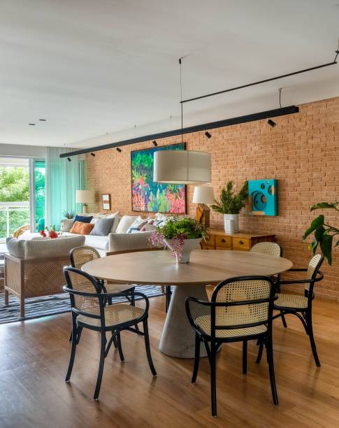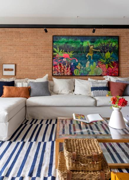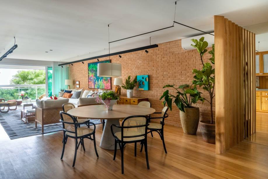 A área social exibe uma combinação ousada e harmônica de diversos materiais e texturas, como o tijolinho em tom terracota na parede principal, a madeira no piso, nos móveis e nas marcenarias, a palhinha natural em alguns detalhes do mobiliário, a serralheria preta com vidro aramado nas portas de correr e a textura de concreto aplicada nas vigas e pilares aparentes.