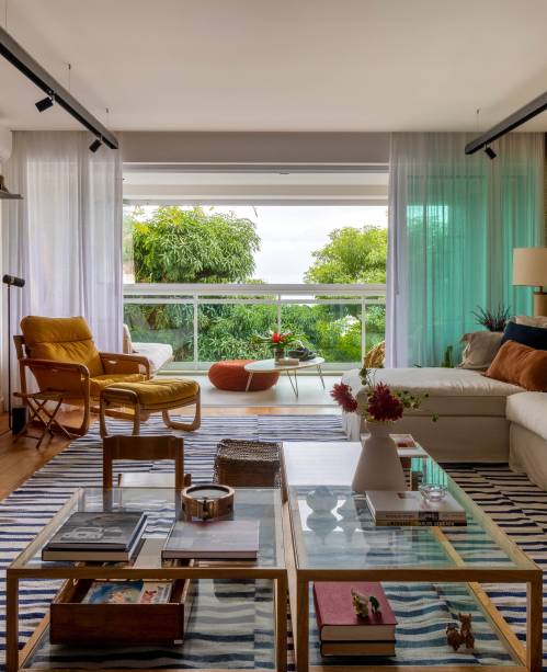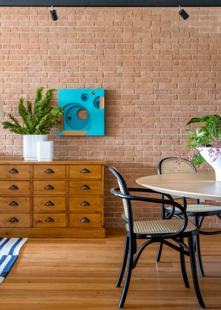 Entre as peças de mobiliário assinado, na sala, vale destacar algumas criações brasileiras, como a chaise com banqueta Pitu (de Aristeu Pires), o par de mesas de centro Mínima (da dupla Luciana Martins e Gerson Oliveira) e o par de poltronas Morere com encosto em treliça (de Gracia Mendes), todas fornecidas pelo @ArquivoContemporaneoOficial. Também chamam a atenção das cadeiras de jantar em estilo Thonet, com estrutura de madeira vergada tingida de preto e assento em palhinha natural.