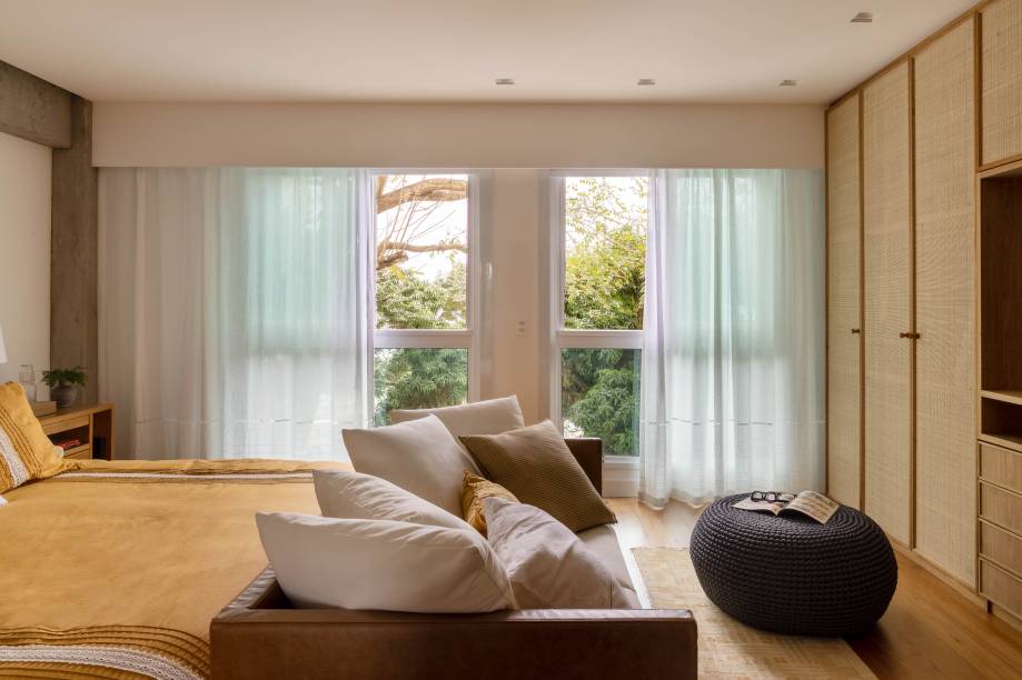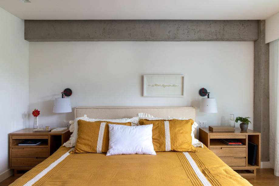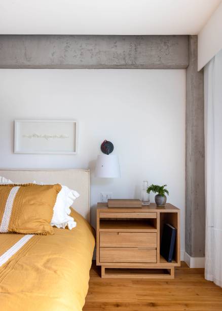 “Apenas o tijolinho que havia na parede principal da sala foi mantido e replicado nas paredes do quarto do filho. O restante é novo”, conta Patricia Landau. “Também aplicamos textura de concreto em algumas vigas e pilares que já estavam aparentes”, acrescenta Carolina.