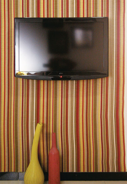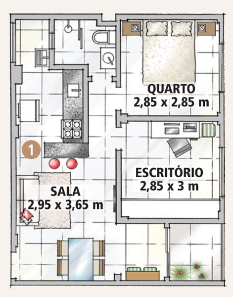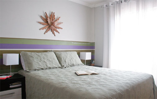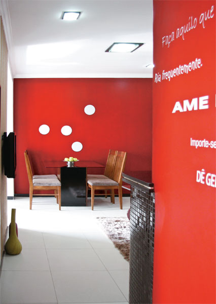 O primeiro lar de Adna e Allan Feio é provisório, mas nem assim improvisado. Eles já estavam pagando o apartamento comprado na planta quando marcaram o casamento. Partiram, então, em busca de um endereço para os três anos iniciais da vida a dois. Pensando em investir o dinheiro, financiaram um imóvel de 45 m², usado, em fase final de reforma. “O proprietário anterior havia trocado todos os revestimentos”, conta Allan. “Concluímos a iluminação e a bancada do banheiro e deixamos a decoração com a nossa cara.” A base dos ambientes conta com piso de porcelanato bege, rodapés e soleiras de granito preto e paredes offwhite (um branco que não é puro). Como forma de aquecer o visual, o casal pintou de vermelho duas paredes, cobriu uma outra de tecido listrado e deu um toque colorido ao quarto. “O que pusemos neste apartamento foi pensado para ele. Por isso, os móveis são pequenos e poucos”, afirma o morador. “Mas é claro que alguns itens podem ir com a gente no futuro, principalmente os eletrodomésticos.”