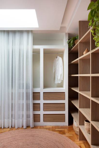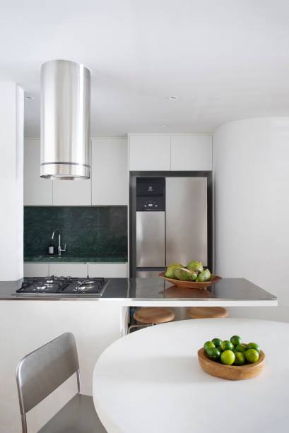 Como este será o apartamento de infância das filhas, foram trabalhados elementos que remetem à experimentação e às formas lúdicas. “Sob a claraboia no quarto do casal, criamos um grande closet e um espaço multiuso, onde eles guardam os livros, trabalham e passam tempo de qualidade com as crianças. Também tivemos a ideia de abrir a cozinha desde o início, imaginando a família tomando café da manhã ao redor da mesa redonda integrada à sala”, conta Pedro.