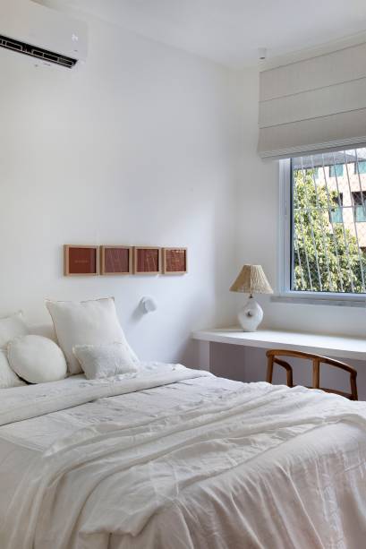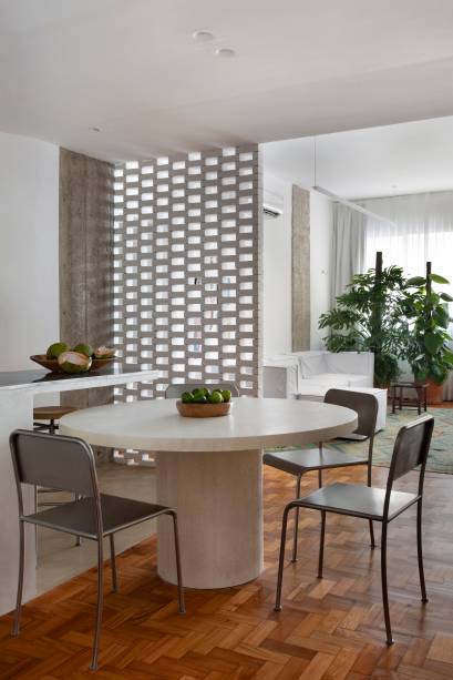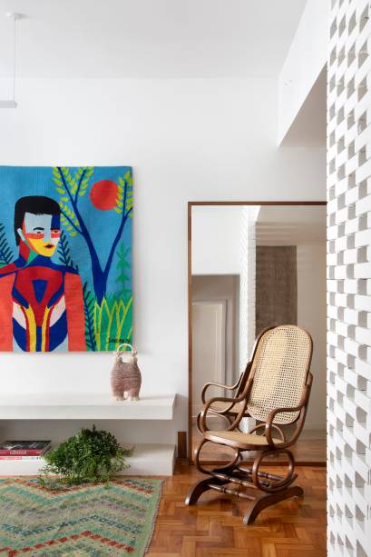 Outro elemento marcante é a divisória vazada entre a sala e a cozinha, feita com tijolinhos e pintada de branco, que dá a ideia de uma parede de cobogós. Já no quarto do casal, foi preservada uma faixa da parede revestida com azulejos originais, encontrados durante a demolição.