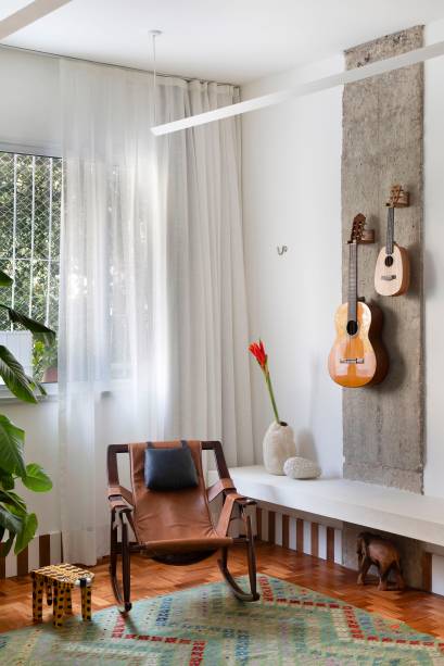 Quanto à composição do mobiliário, foram mantidos alguns móveis do acervo dos clientes, como o sofá, a cadeira de balanço e as redes, “item essencial na casa de um cearense”, segundo o morador. Entre as novas peças, destacam-se a mesa lateral (ao lado do sofá) de Celina Zilberberg, o banco Magrini, de Sérgio Rodrigues, e a poltrona de balanço do Liceu de Artes e Ofício.