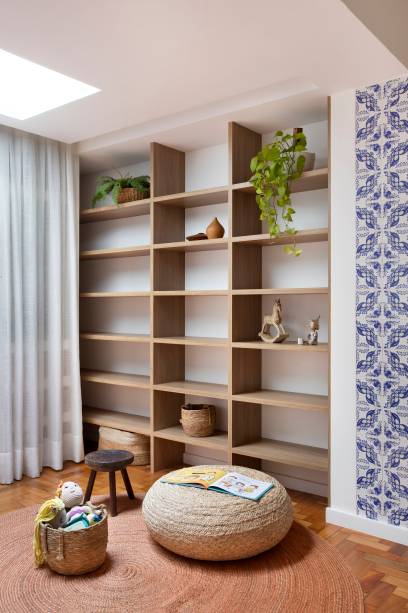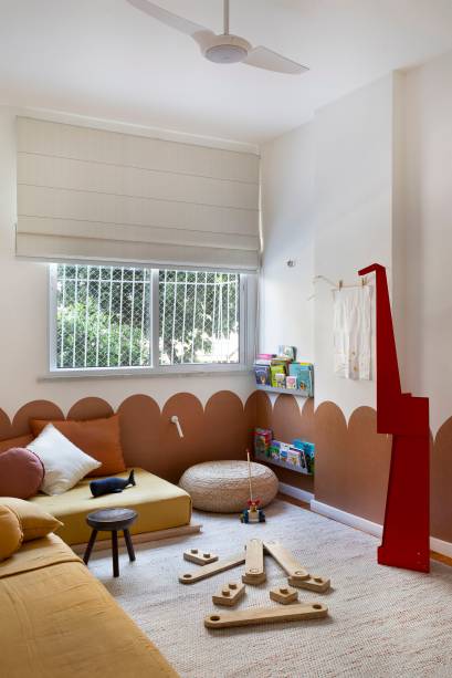 Essa proposta tem continuidade no quarto das crianças, com camas montessorianas e um amplo espaço para brincadeiras. O papel de parede, chamado petit bric, foi desenhado pelos arquitetos. “Trabalhamos um quarto infantil e não infantilizado, trazendo formas lúdicas, femininas, obras de arte, acolhimento e alegria”, descreve Mariana.
