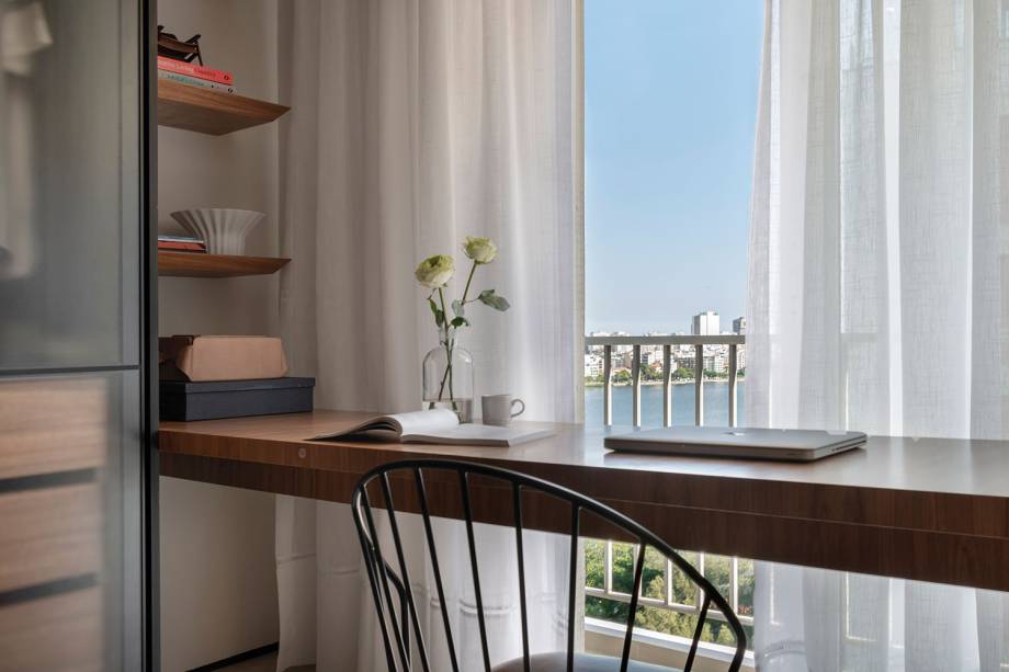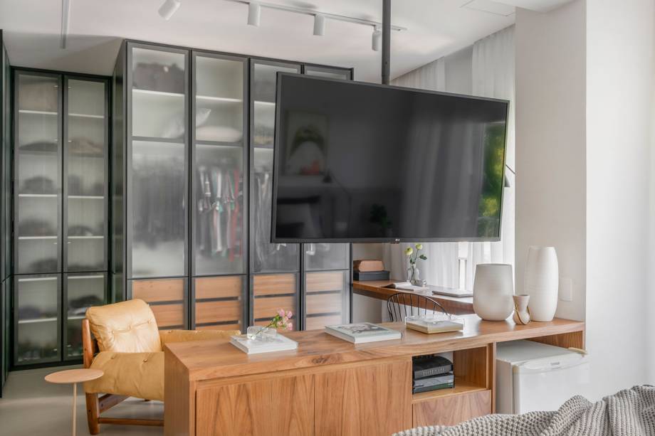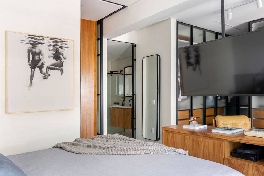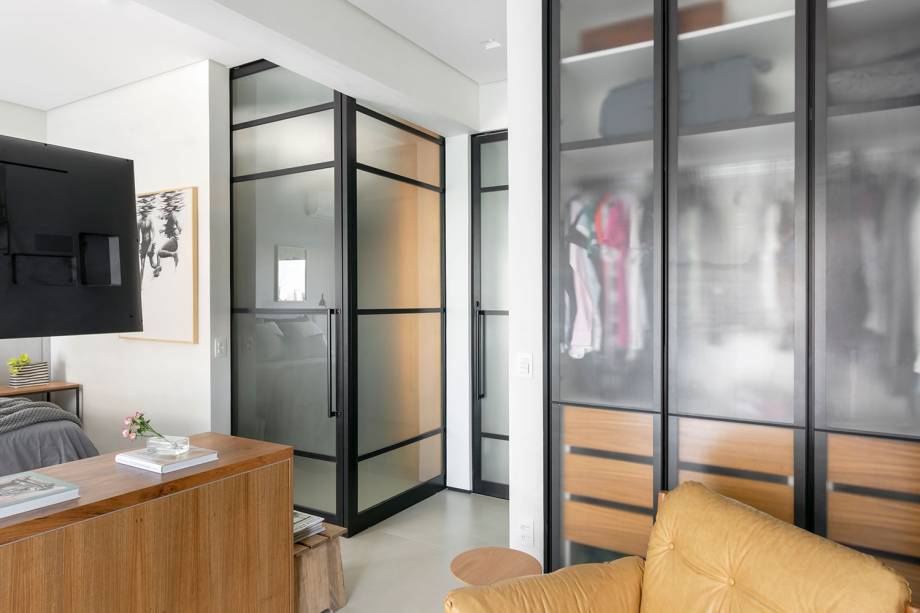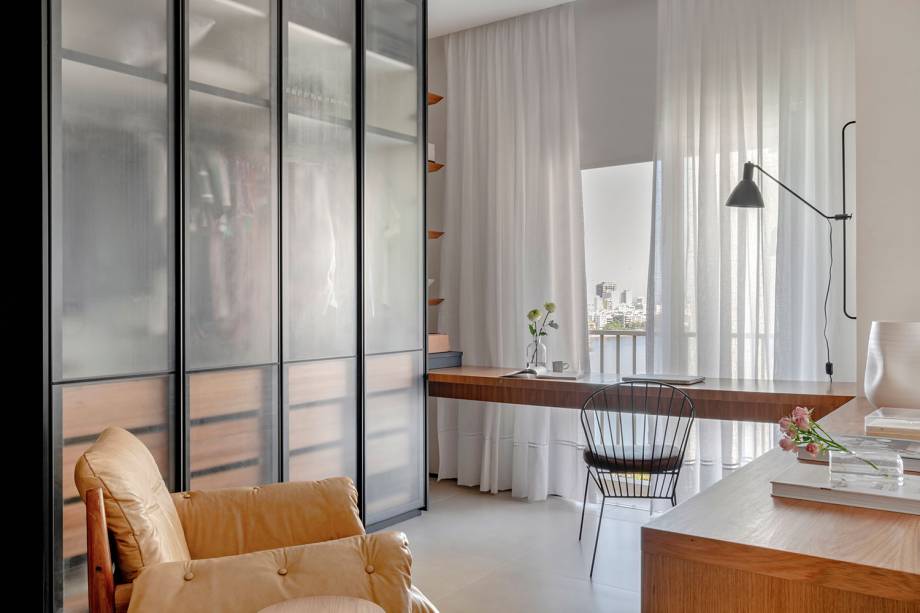 A posição original do quarto foi invertida, criando escritório e closet. Para dar unidade ao projeto, a mesma linguagem de materiais se repete nas portas dos armários, na serralheria das portas de acesso ao cômodo e em outros pontos da decoração. A ideia era deixar o espaço amplo, com uma pegada de loft industrial.