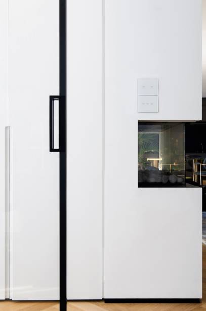 “Eles nos apresentaram uma tarefa complexa: criar uma abundância de espaços abertos, iluminados e transparentes por um lado, com soluções de armazenamento; e separação e ocultação, por outro lado, existindo lado a lado sem evocar uma contradição interna. E se isso não for desafiador o suficiente, então o envelope externo do apartamento – localizado em um novo prédio – não poderia ser alterado”, dizem os profissionais.