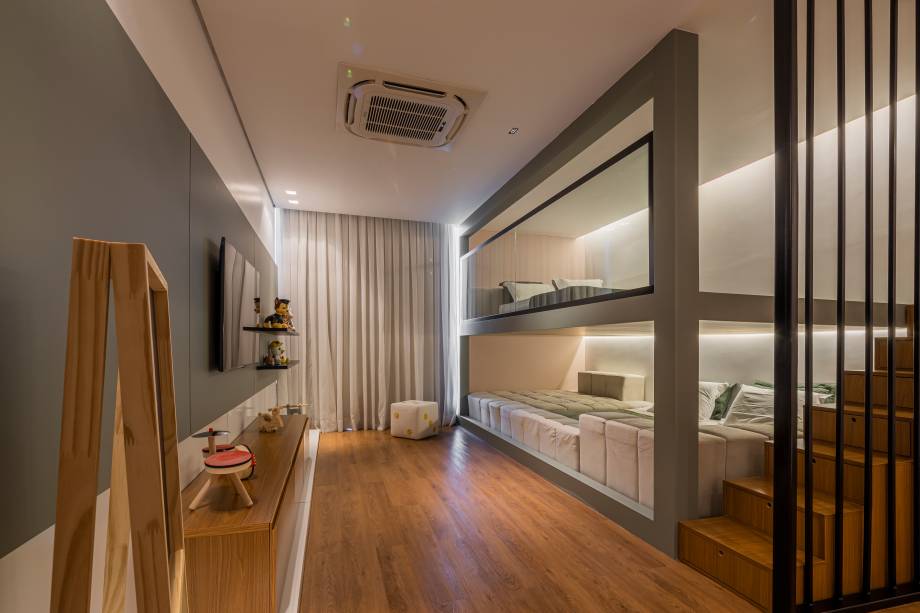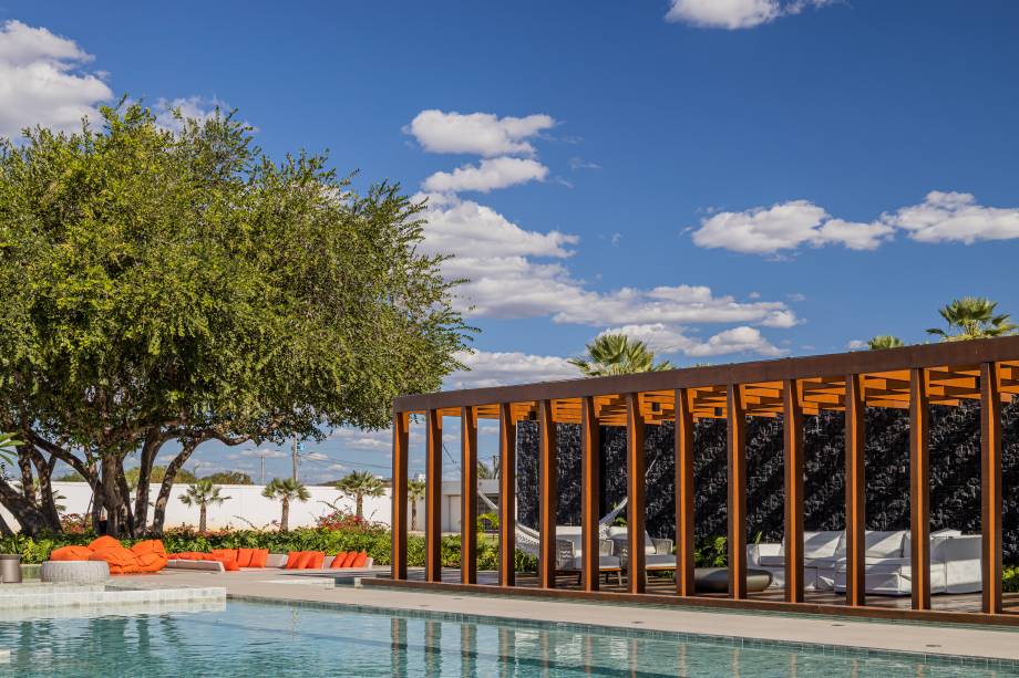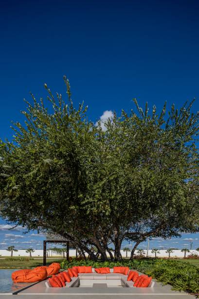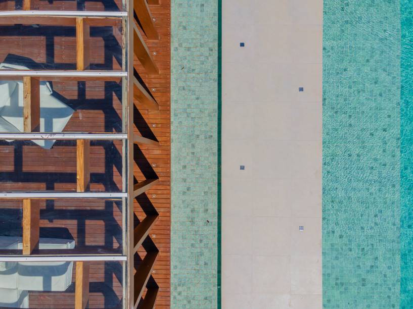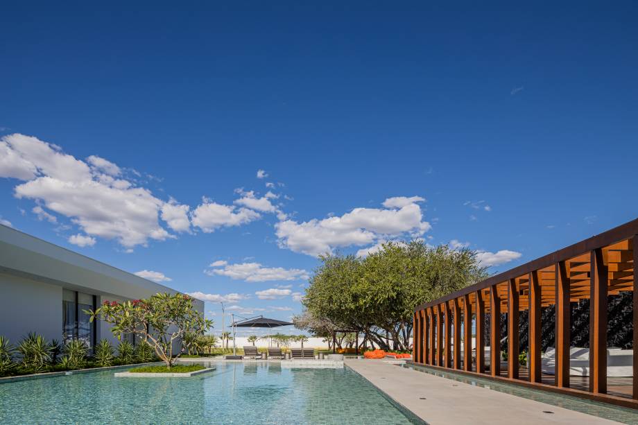 “A integração entre os ambientes ocorre por meio da sala de estar e áreas gourmet, que conectam os usuários em um espaço convidativo e cenográfico: a área de lazer com piscina infantil e adulta, e um deck coberto e circundado por um espaço d’água”, explicam os profissionais.