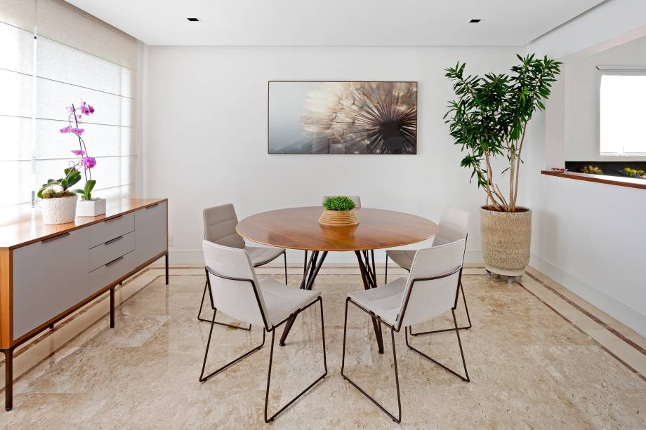 Essa integração com a sala de estar e, consequentemente, com a área externa, proporcionou amplitude e conexão da entrada com a varanda. Foi o que deu o status de casa à cobertura, complementado pelo projeto de paisagismo assinado pelo Oui Paisagismo.