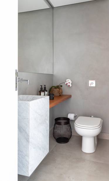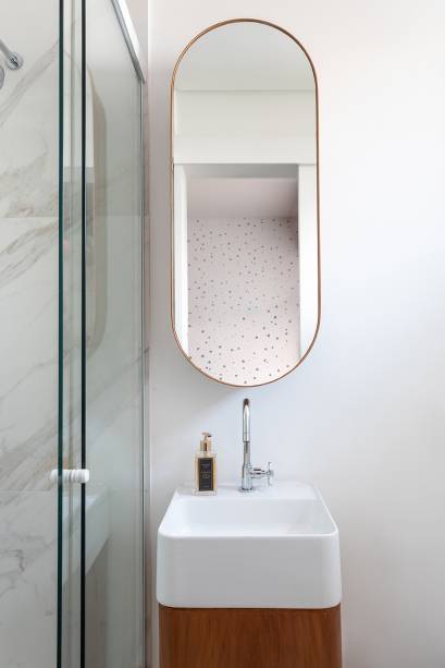 A fim de que a porta de entrada não ficasse dentro da sala, Ana optou por jogá-la para a lateral. Outra mudança na planta original foi a criação de um lavabo a partir de um dos banheiros do quarto, que era muito grande e foi dividido, abrindo para a sala.