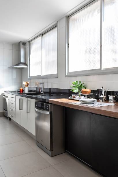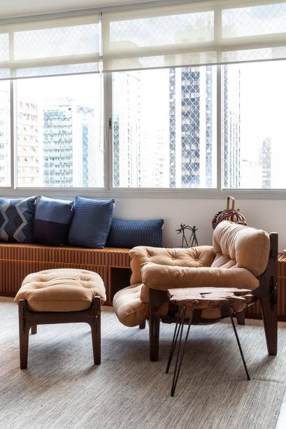 Para o décor, a arquiteta optou por tons neutros, tanto nas paredes quanto no mobiliário. As paredes são brancas e o piso é de taco de madeira original, enquanto a marcenaria é de peroba mica.