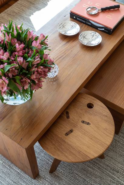 Para solucionar o desafio de armazenamento, a arquiteta montou uma marcenaria que entrou no visual da sala. “Conseguimos colocar os itens em um armário sem ser careta, todo ‘fechadinho’, e que servisse também como aparador para sala de jantar”, conta.