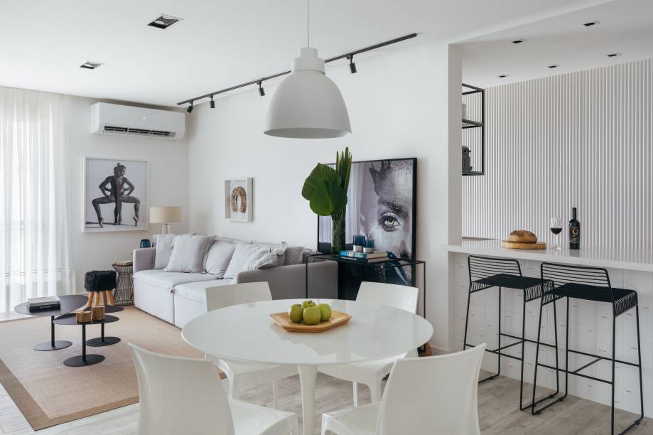 Estilo escandinavo inspira décor de apê de 84m² com paleta preta e branca