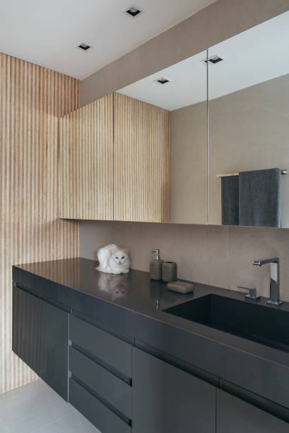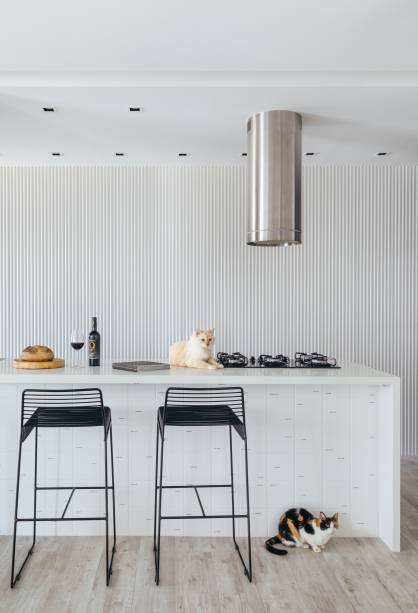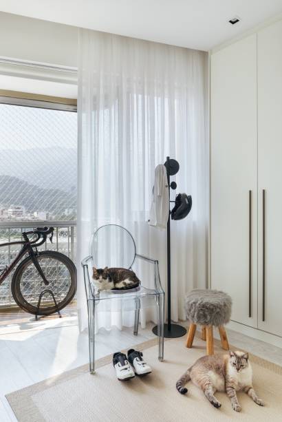 “Ela pediu uma cozinha integrada à sala, um closet com muitos armários, um quarto de hóspedes confortável e que a casa fosse adaptada para seus cinco gatinhos”, acrescenta.