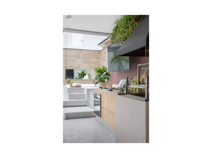 “Para otimizar a área gourmet, projetamos um grande banco de alvenaria, revestido com porcelanato que imita madeira, em toda a extensão dele, servindo de assento para a mesa de jantar e chaise longue em sua extremidade.