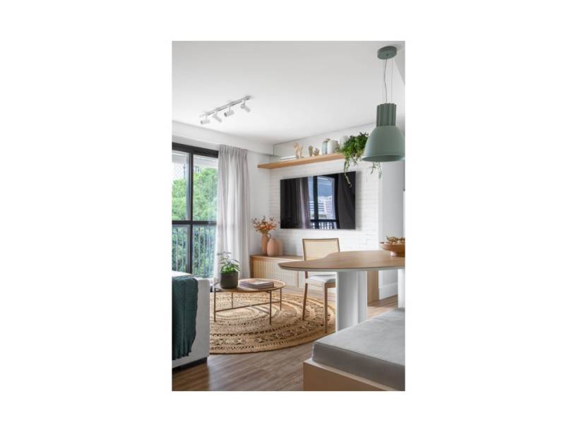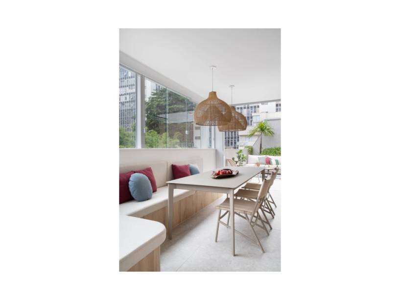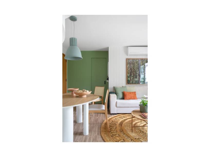 A arquiteta conta ainda que se inspirou na arquitetura escandinava, com um toque de boho-chic, para definir o conceito do projeto, mesclando cores claras e tons terrosos associados ao verde com materiais que remetem à natureza, como a palha natural – presente em luminárias, portas de armários e tapetes -; o porcelanato que imita textura de rocha; e as plantas.