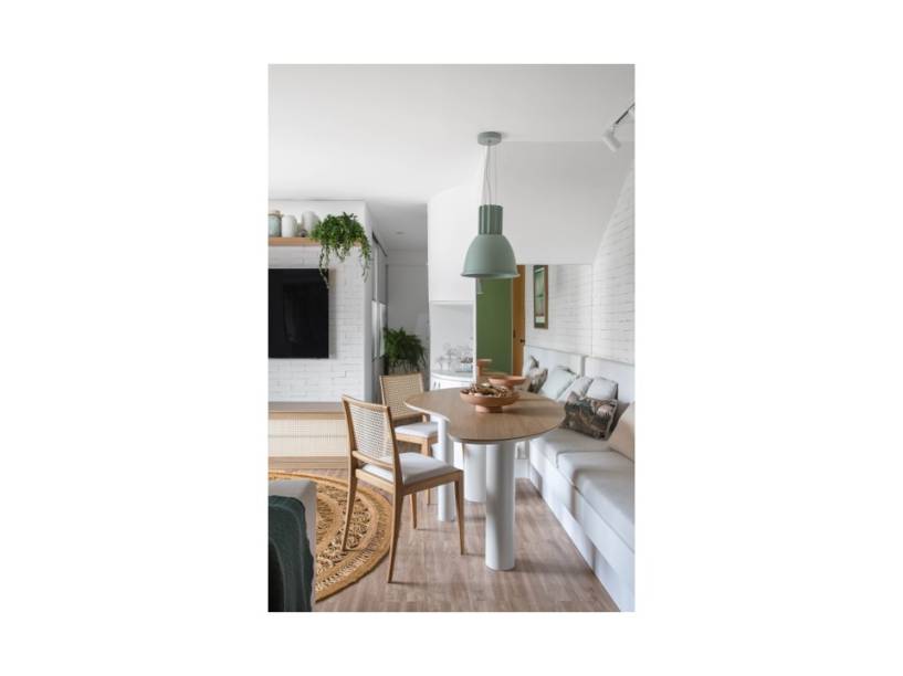Como a cliente tinha uma mesa quadrada com quatro cadeiras, que atrapalhava a entrada, no novo projeto, a arquiteta criou um banco em marcenaria e desenhou uma mesa com formato orgânico, não só para melhorar a circulação da sala como também para acomodar até seis pessoas.