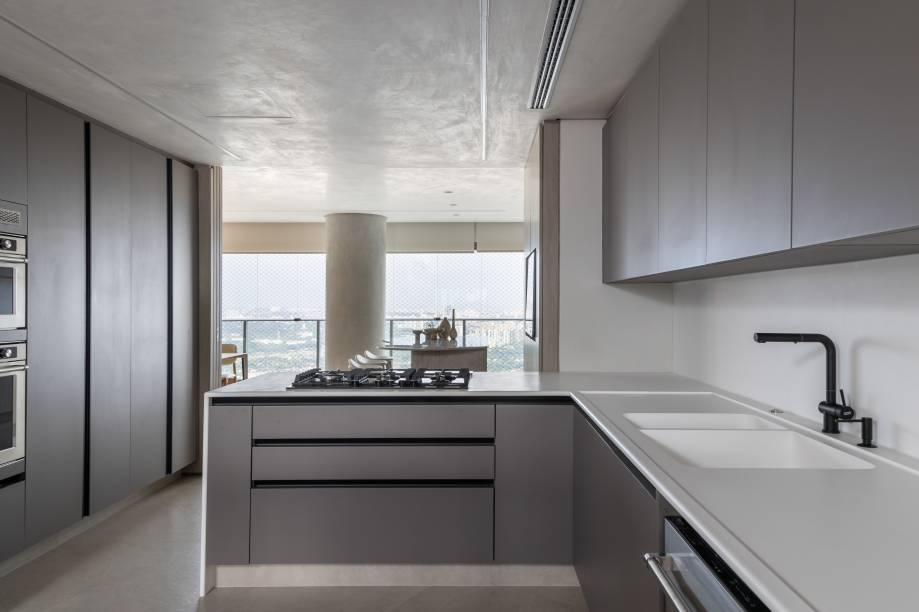 O layout da cozinha conta com uma grande bancada em U de corian, com o cooktop posicionado com vista para área social – ou seja, a pessoa que estiver cozinhando no lado oposto da bancada não fica isolada dos convidados em dias de visita.