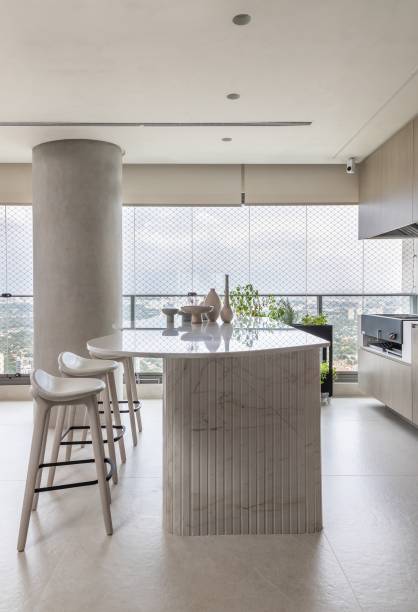 O sofá-ilha cria um ambiente de home theater e um de estar. A mesa redonda no dia a dia funciona como uma mesa de jogos para a família e, em ocasiões quando os proprietários recebem mais convidados, vira uma extensão do jantar, assim como o nicho se faz de buffet.