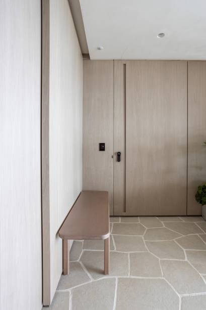 A marcenaria permeia todo o apartamento: painéis, muitos armários para armazenamento e passagens exibem a madeira, mas com toques diferenciados em cada espaço. No hall, por exemplo, os brises giratórios dão um pouco mais de privacidade, despertam a curiosidade de quem entra e também permitem a passagem de luz. A porta de entrada é pivotante e foi revestida com folhas de madeira, ficando camuflada nos painéis.