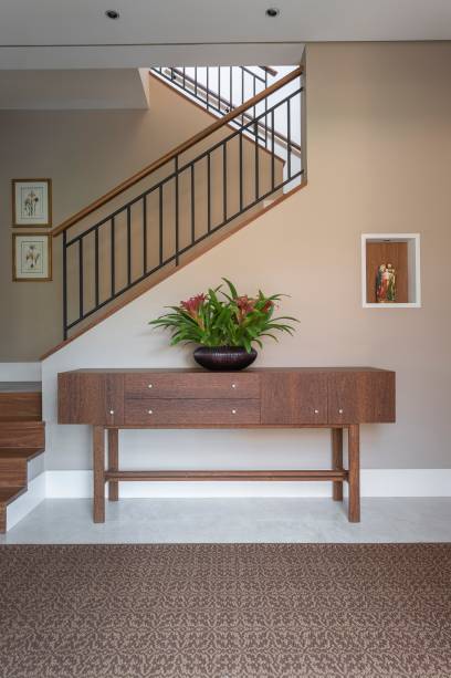 Já a parte inferior, que segue o mesmo piso dos cômodos de cima, conta com um quarto de hóspedes para quem não puder subir as escadas. Na entrada, foi inserida uma chapelaria. E, porque a proprietária tem o cuidado em escolher produtos de fácil manutenção, todos os tapetes foram feitos com material sintético que é fácil de limpar.